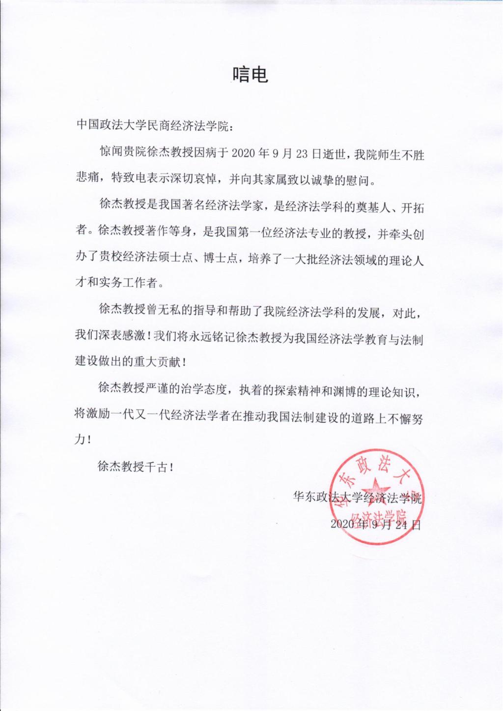华东政法大学经济法学院唁电