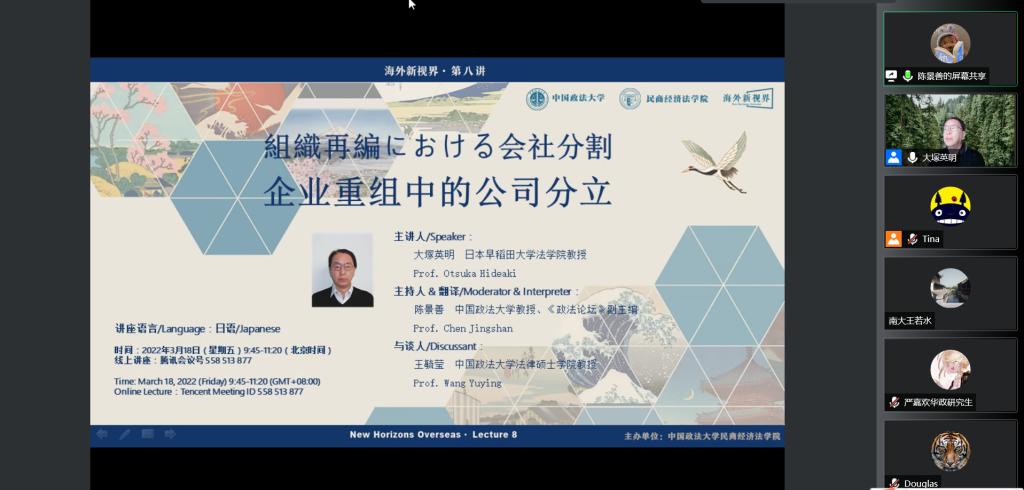 2022年3月18日上午,日本著名的公司法专家、早稻田大学法学院大塚英明(Otsuka Hideaki)教授通过线上方式,为中国政法大学网上投注app
